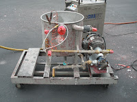 The mixing pots had resin buildup in some areas that was at least 2 inches thick. We used a 375CFM air compressor that produces 150PSI to remove this buildup. The higher pressure allowed us to cut right through the buildup and reach the original substrate. Cleaning the pots took quite a long time though due to all of their intricacies.