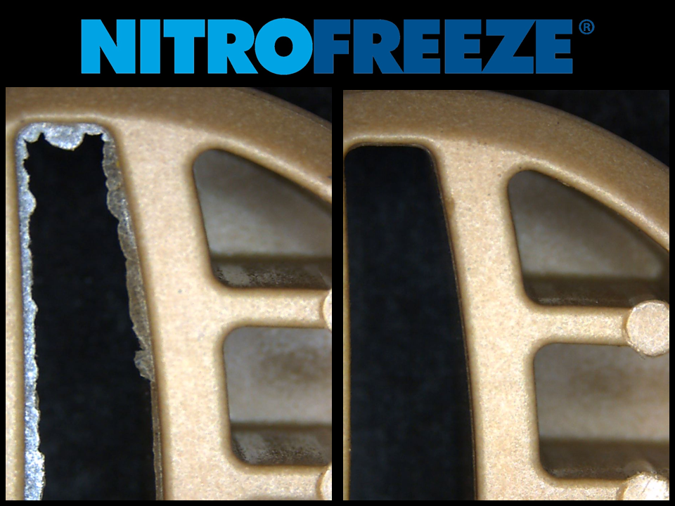 Nitrofreeze® Cryogenic Deflashing provides OEM manufacturers, job shops, and molding houses with reliable and efficient way for them to deflash Polyetheretherketone (PEEK) molded parts. Cryogenic deflashing utilizes polycarbonate blast media and part tumbling in a cryogenic atmosphere to remove residual flash material. Below is a deflashing study of a molded PEEK part: